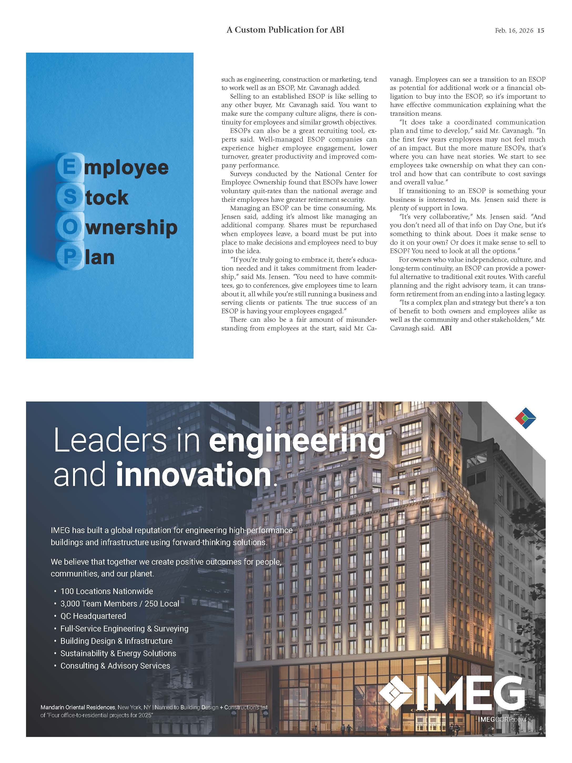 We were honored to have Rayser’s President and CEO, Michelle Jensen, featured in an article in the February 16th edition of the Iowa Association of Business and Industry (ABI)’s Business Monthly magazine to discuss how ESOPs, like ours, can be a tremendously positive and impactful tool for Iowa business owners looking to preserve their legacies.